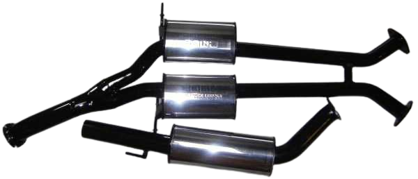 Twin 2.5" (63mm) into single 3" (76mm) rear muffler with three stainless performance mufflers.