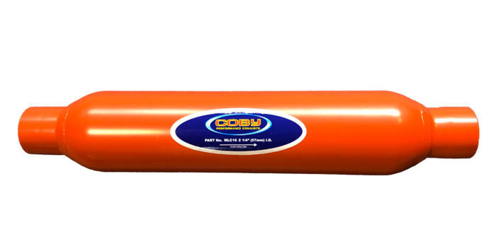 Medium Large Coby 2 1/4" (57mm) inlet and outlet 4" diameter 16" long barrel Expansion Chamber in inlet end Perforated core Fibre glass packed