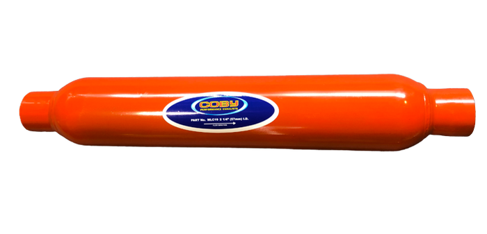 Medium Large Coby 2 1/4" (57mm) inlet and outlet 4" diameter 19" long barrel Expansion Chamber in inlet end Perforated core Fibre glass packed
