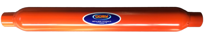 Medium Large Coby 2 1/4" (57mm) inlet and outlet 4" diameter 25" long barrel Expansion Chamber in inlet end Perforated core Fibre glass packed