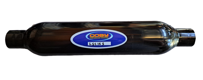 Large Super Coby 2" (51mm) inlet and outlet 4" diameter 16" long barrel Expansion Chamber in inlet end Perforated core Packed with stainless steel wool